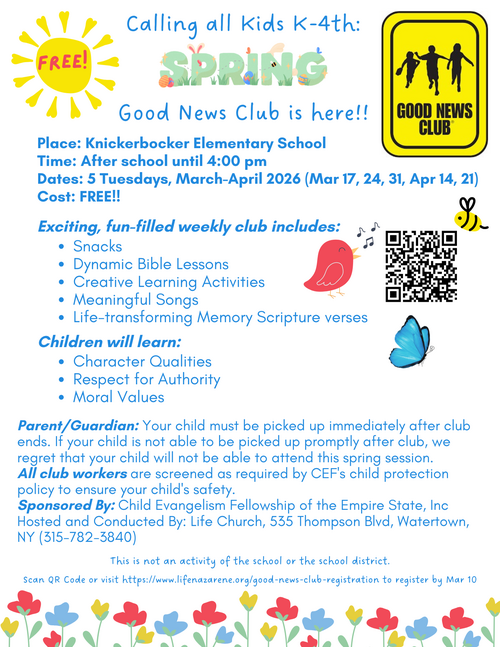 My registered child(ren) is allowed to attend the Good News Club every Tuesday after school until 4:00 pm, on the designated dates. There will be no club on half days, school holidays, or snow days. I understand that it is my responsibility to pick up my child(ren) promptly at 4:00 pm, and failure to do so will jeopardize my child(ren)'s continued participation. Participation implies consent for pictures to be posted on Life Church's website and Social Media. By signing your full name below, you agree to the above: